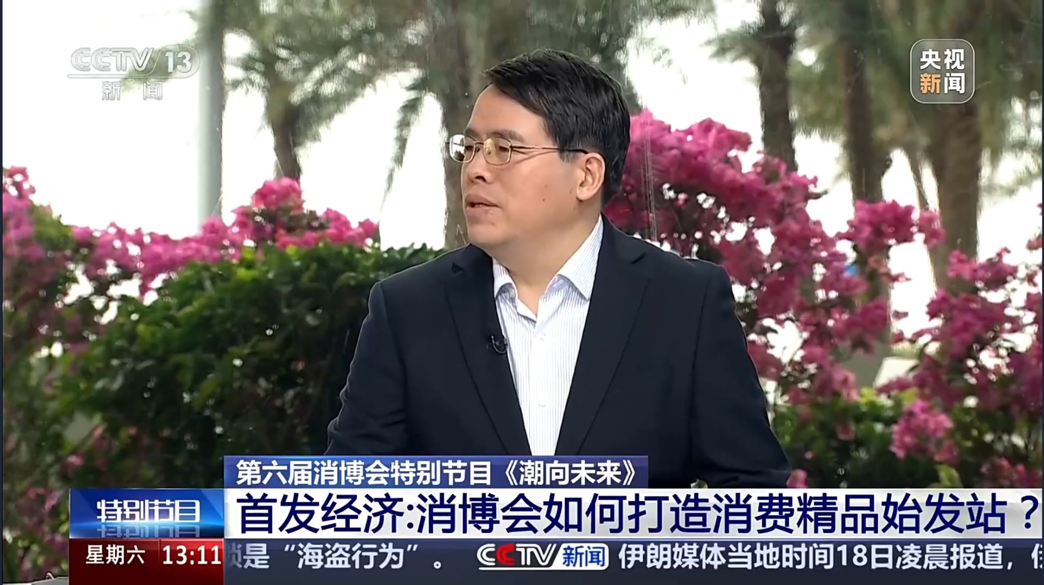 频道消博会特别节目《潮向未来》演播室,围绕“首发经济”与“消费新场景”等议题接受专访。