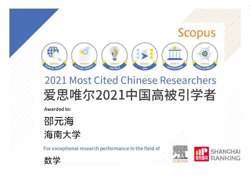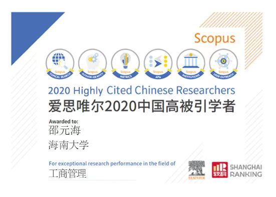 管理学院邵元海教授在2020年作为工商管理学科高被引学者入选该榜单后,2021年再次作为数学学科高被引学者入选该榜单。