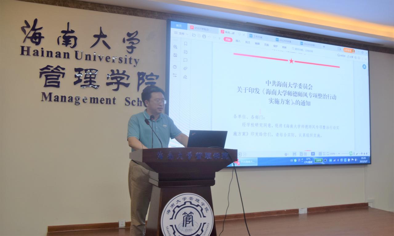 付景涛在会上传达了学校关于师德师风专项整治行动实施方案的文件精神,并介绍了学院教职工师德师风 “四评”工作方案以及相关工作内容。