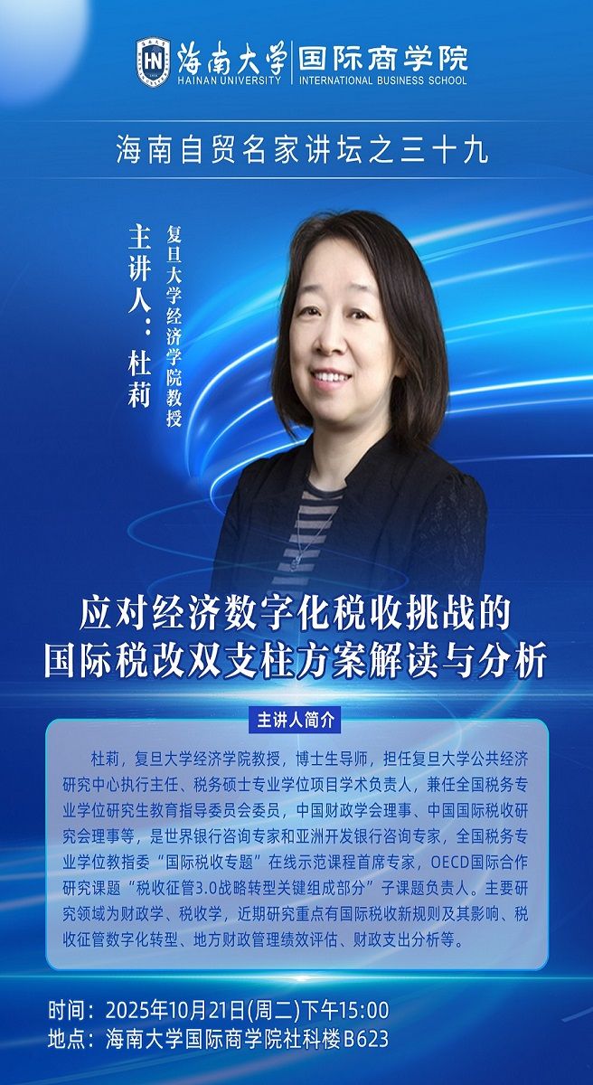 杜莉,复旦大学经济学院教授,博士生导师,担任复旦大学公共经济研究中心执行主任、税务硕士专业学位项目学术负责人,兼任全国税务专业学位研究生教育指导委员会委员,中国财政学会理事、中国国际税收研究会理事等,是世界银行咨询专家和亚洲开发银行咨询专家,全国税务专业学位教指委“国际税收专题”在线示范课程首席专家,OECD国际合作研究课题“税收征管3.0战略转型关键组成部分”子课题负责人。主要研究领域为财政学、税收学,近期研究重点有国际税收新规则及其影响、税收征管数字化转型、地方财政管理绩效评估、财政支出分析等。
