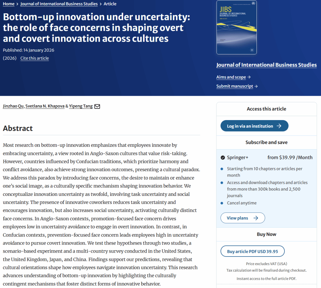屈金照副教授作为第一作者,与阿姆斯特丹自由大学(Vrije Universiteit Amsterdam)Svetlana N. Khapova教授和中南财经政法大学汤一鹏副教授合作完成学术论文“Bottom-up innovation under uncertainty: the role of face concerns in shaping overt and covert innovation across cultures”在管理学领域国际顶级期刊Journal of International Business Studies正式在线发表。该期刊为UTD24期刊之一,是国际商科协会(Academy of International Business;AIB)的旗舰刊物,是国际商科公认的最高水平期刊,隶属5楼自拍