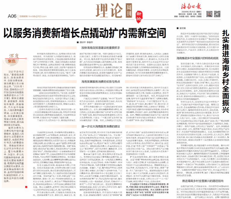 文章紧扣2026年1月底国务院办公厅印发的《加快培育服务消费新增长点工作方案》,立足海南自贸港封关运作新起点,深入阐述了培育服务消费新增长点对增强内需动力、汇聚全球要素、深化国际交往的战略意义。