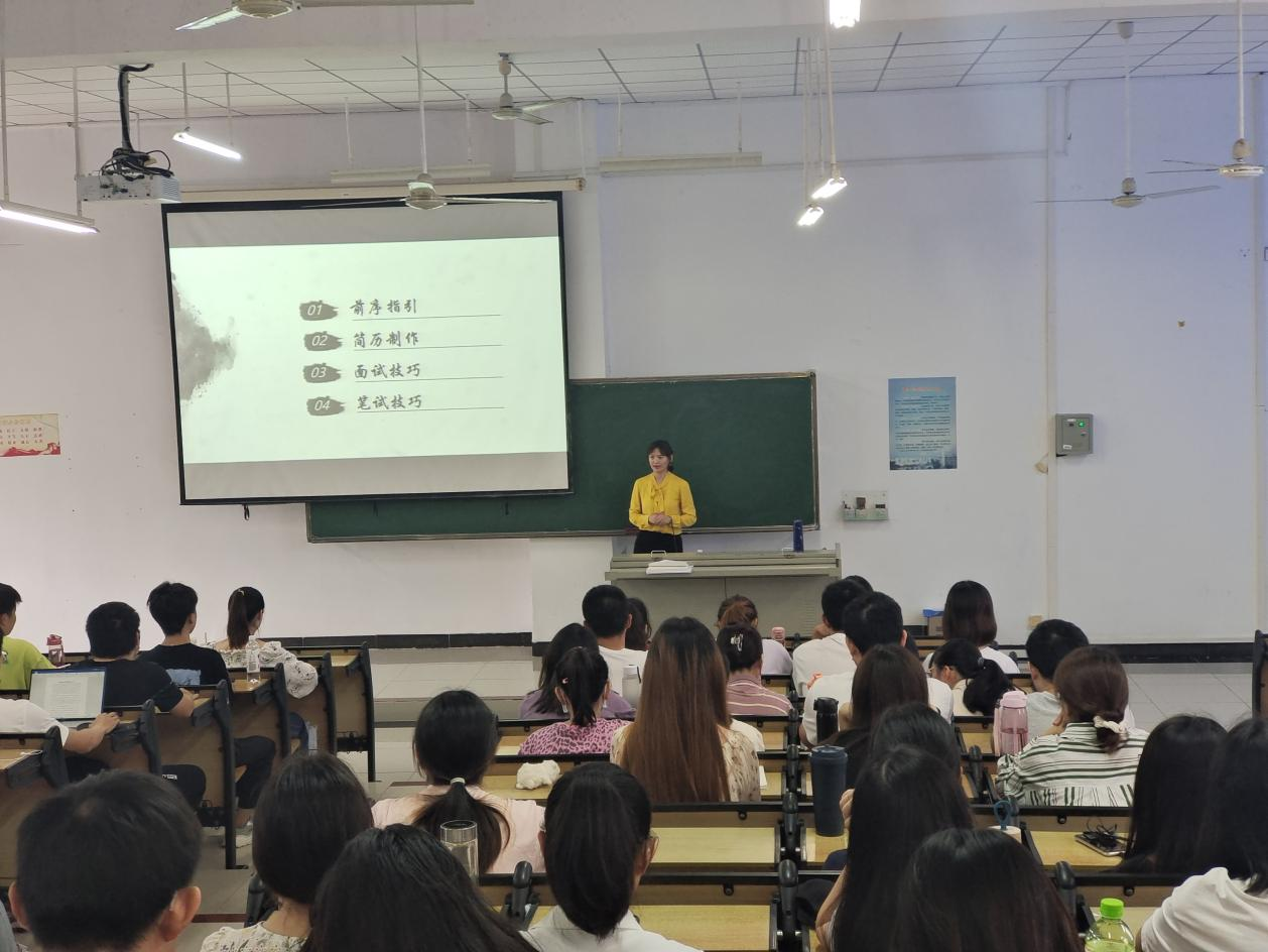 MBA优秀校友、公司治理英才班(第一期)学员、海南京楚投资集团有限公司人力资源总监、事业发展部总监袁茵女士在5-213为2018级应届毕业生作求职简历制作与面试技巧讲座报告。会议由学工办李春老师主持。
