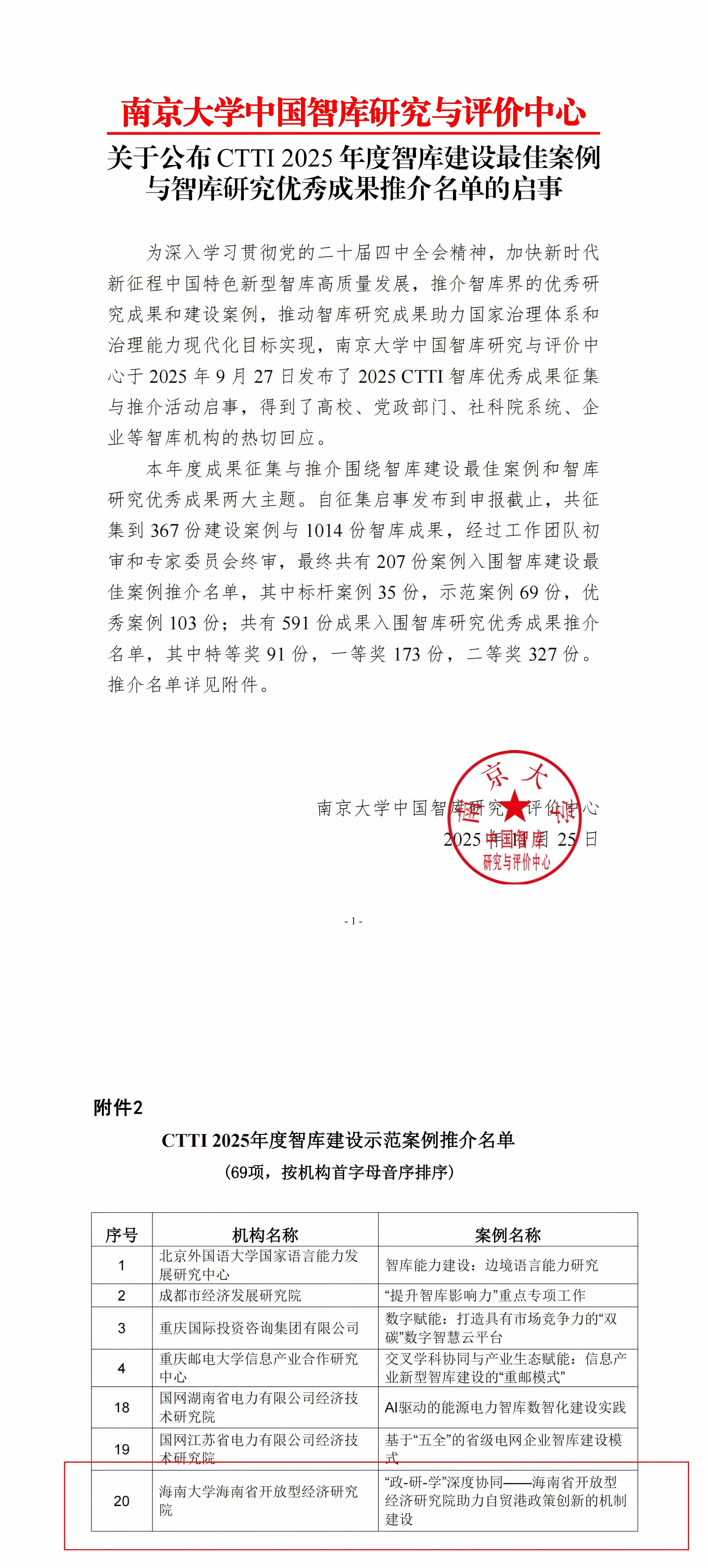 CTTI(中国智库索引)是由南京大学中国智库研究与评价中心开发的权威智库评价平台。2025年度共征集全国367份建设案例,经初审与专家评审,最终评选出示范案例69份。海南省开放型经济研究院曾于2022年入选CTTI来源智库,2025年亦被AMI收录,持续展现其在国家战略服务与智库建设方面的持续进展。